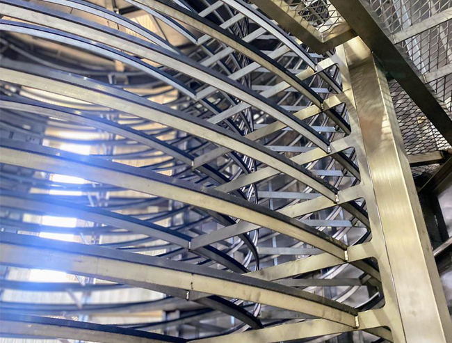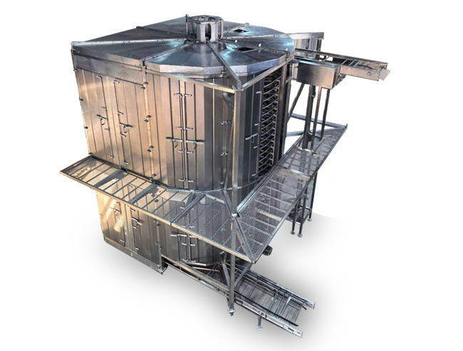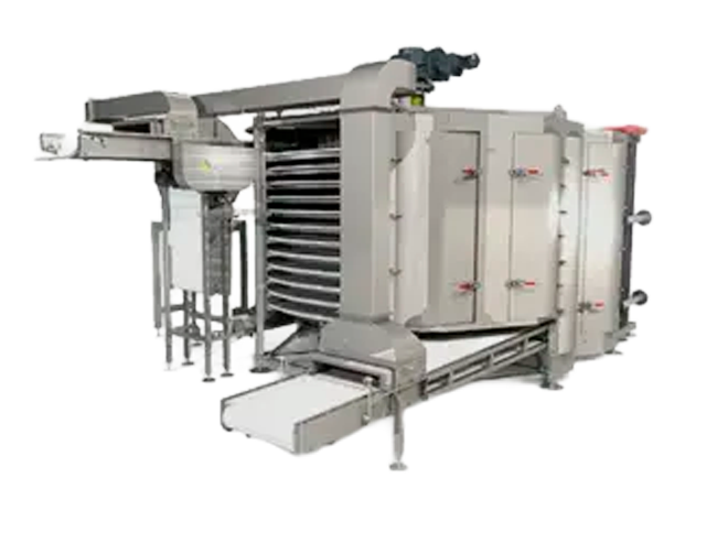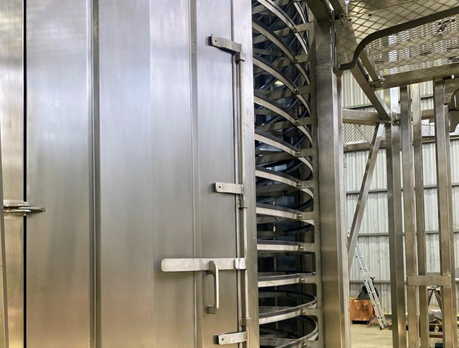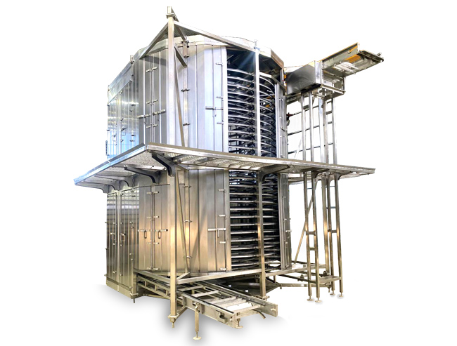 Consistem principalmente em uma esteira transportadora em espiral sobre um tambor giratório, onde o produto a ser congelado entra pela parte inferior e sai congelado pela parte superior, indo diretamente para o processo de embalagem.